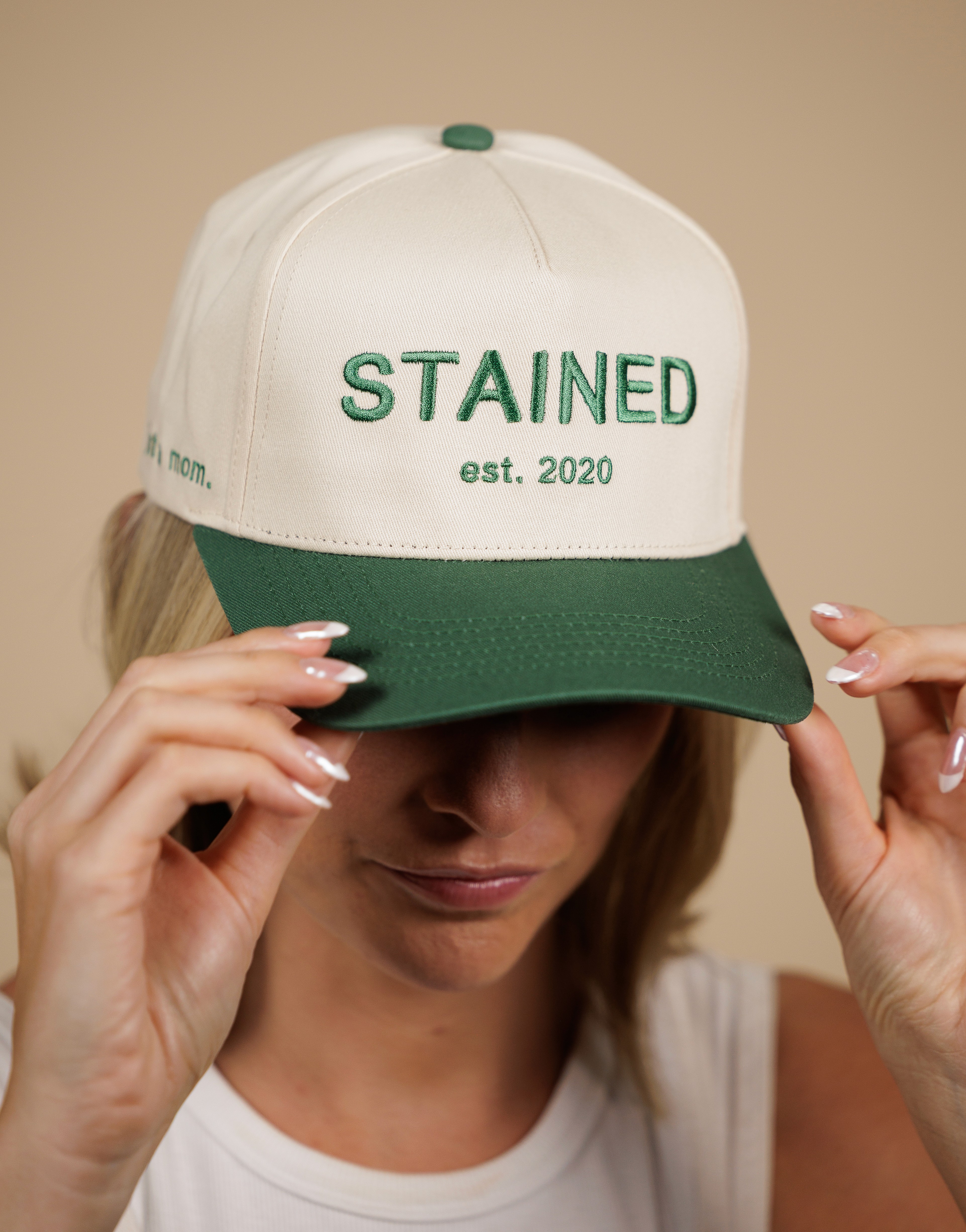 The Stained x Capology dual hat drop features a bold green snapback and soft corduroy dad hat — both celebrating the beauty and chaos of motherhood. Two styles. One truth.
